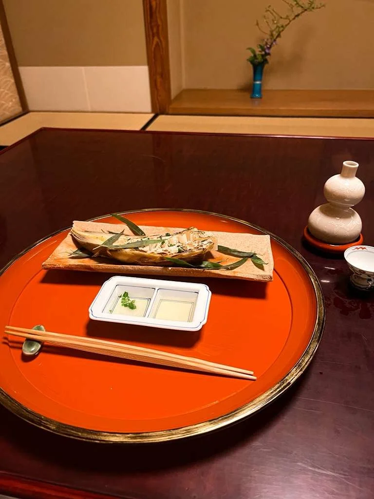 One of the standout components was a grilled bamboo shoot, a delicacy that epitomizes the essence of spring. The bamboo shoot was expertly charred, bringing out its natural sweetness while maintaining a satisfying crunch. Accompanied by a drizzle of fragrant sesame oil, it served as a delightful reminder of the season's bounty, showcasing Kikunoi's dedication to highlighting locally sourced, seasonal ingredients throughout the meal.